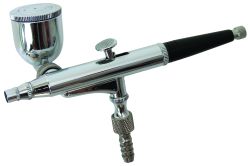 Model AD-7707 jest wykonany z duża dokładnością. Doskonały do malowania cienkich linii i małych plamek. Przeznaczony dla średnio zaawansowanych użytkowników. Farba mieszana jest z powietrzem wewnątrz aerografu. Ilość farby i powietrza regulowana jest płynnie. Dwufunkcyjnym przyciskiem spustowym reguluje się ilość powietrza (wciskając przycisk), oraz ilość natryskiwanej farby (odciągając przycisk do tyłu). Posiada także tylną regulację skoku iglicy. Aerograf zasilany górnie z metalowego zbiorniczka z wieczkiem. Boczne ruchome mocowanie zbiorniczka. W zestawie z aerografem AD-7707 znajduje się końcówka choinkowa do bezpośredniego wpięcia w przewód, kluczyk do aerografu oraz pipetka do farby. Dane techniczne: Nazwa: AD-7707 Kod: 0256.0 Średnica dyszy: 0,2 mm Ciśnienie pracy: 2 bar Pojemność zbiorniczka: 7  cm3 Gwint przyłącza powietrza: 1/8"Z