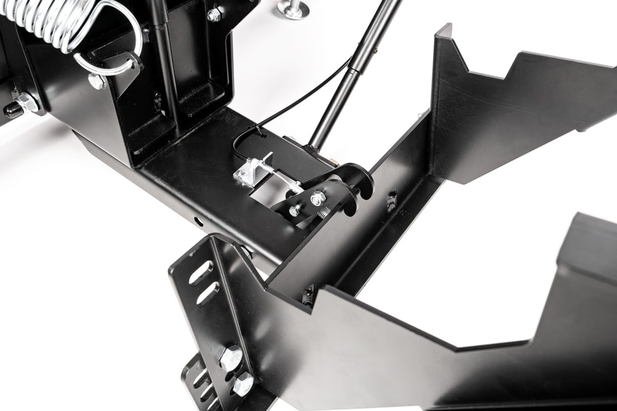 Masz do dyspozycji regulację kąta pracy w 5 położeniach, dzięki czemu ustawisz lemiesz tak, jak potrzebujesz. Całość jest amortyzowana sprężynami, co chroni pług w momencie zetknięcia z przeszkodą. W zestawie znajduje się guma o grubości 15 mm, która poprawia jakość odgarniania i zabezpiecza podłoże.