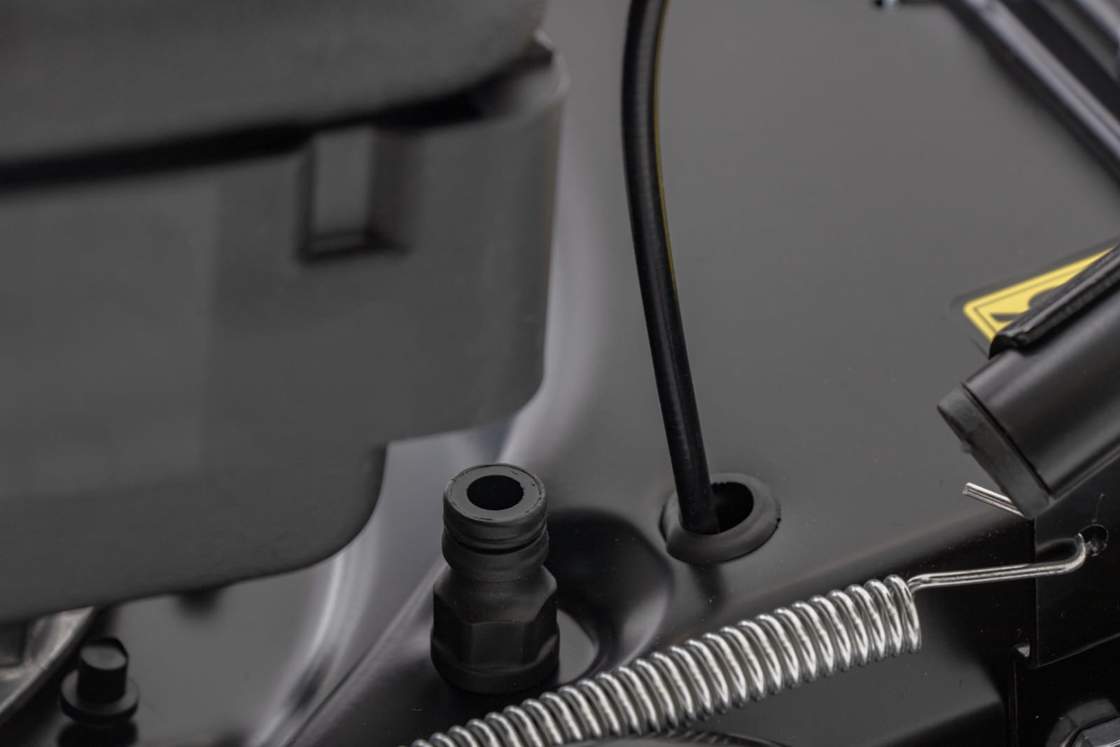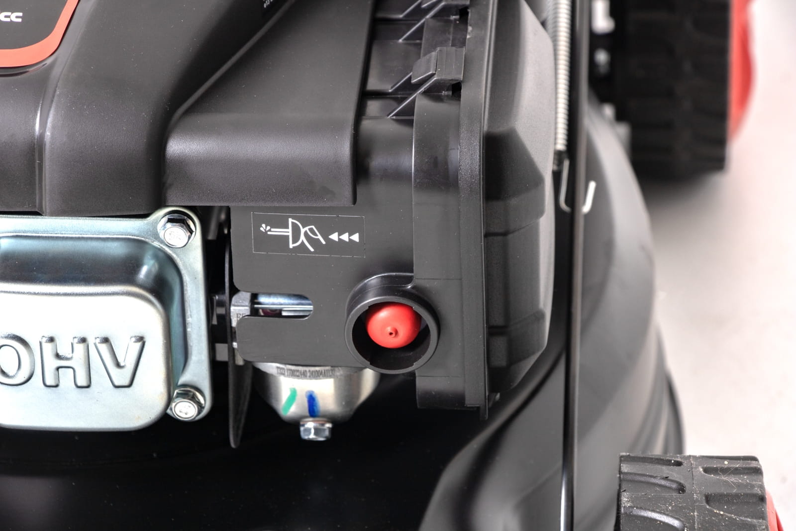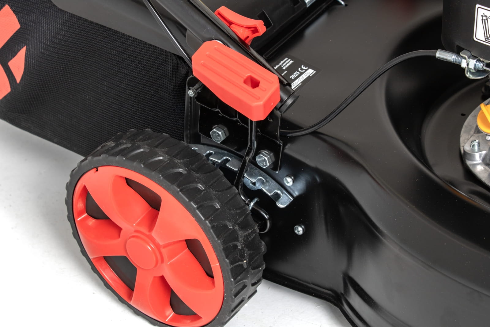 - Centralna regulacja wysokości koszenia – 8 poziomów w zakresie 25–75 mm umożliwia precyzyjne dopasowanie długości trawy.