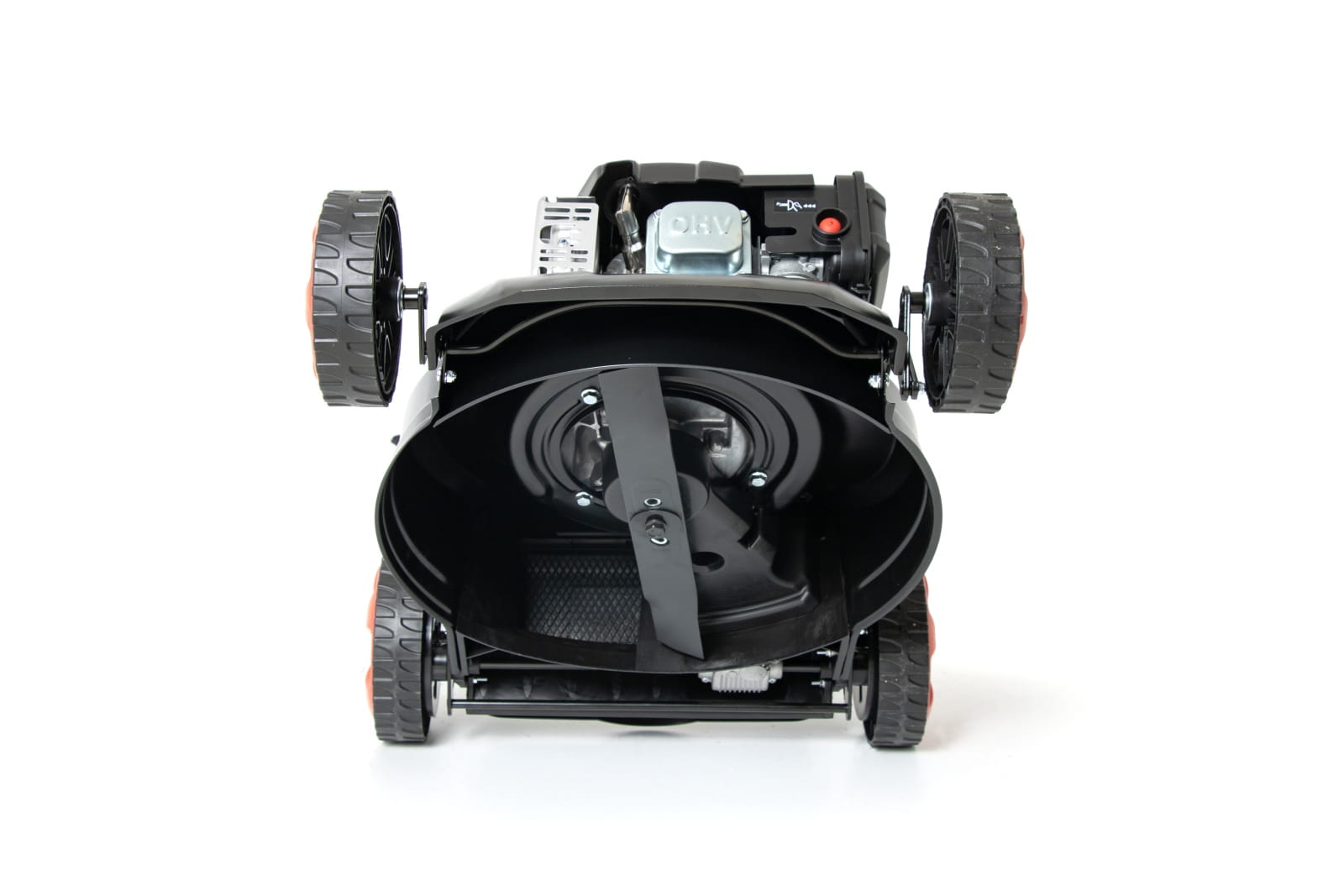 - Napęd na tylne koła – mniejsze zmęczenie i wygodniejsze koszenie nawet na pochyłym terenie.