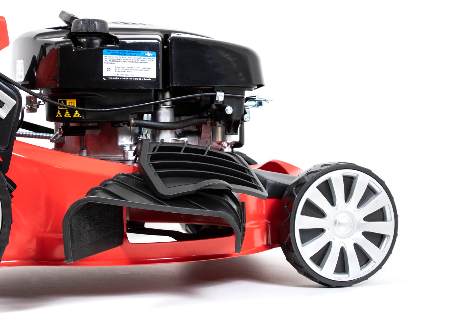 - Napęd + łożyskowane koła – lekkość prowadzenia - Koła o średnicy 20 i 27,5 cm zapewniają stabilność, a napęd GT pozwala prowadzić kosiarkę niemal bez wysiłku – szczególnie na pochyłościach i większych terenach.