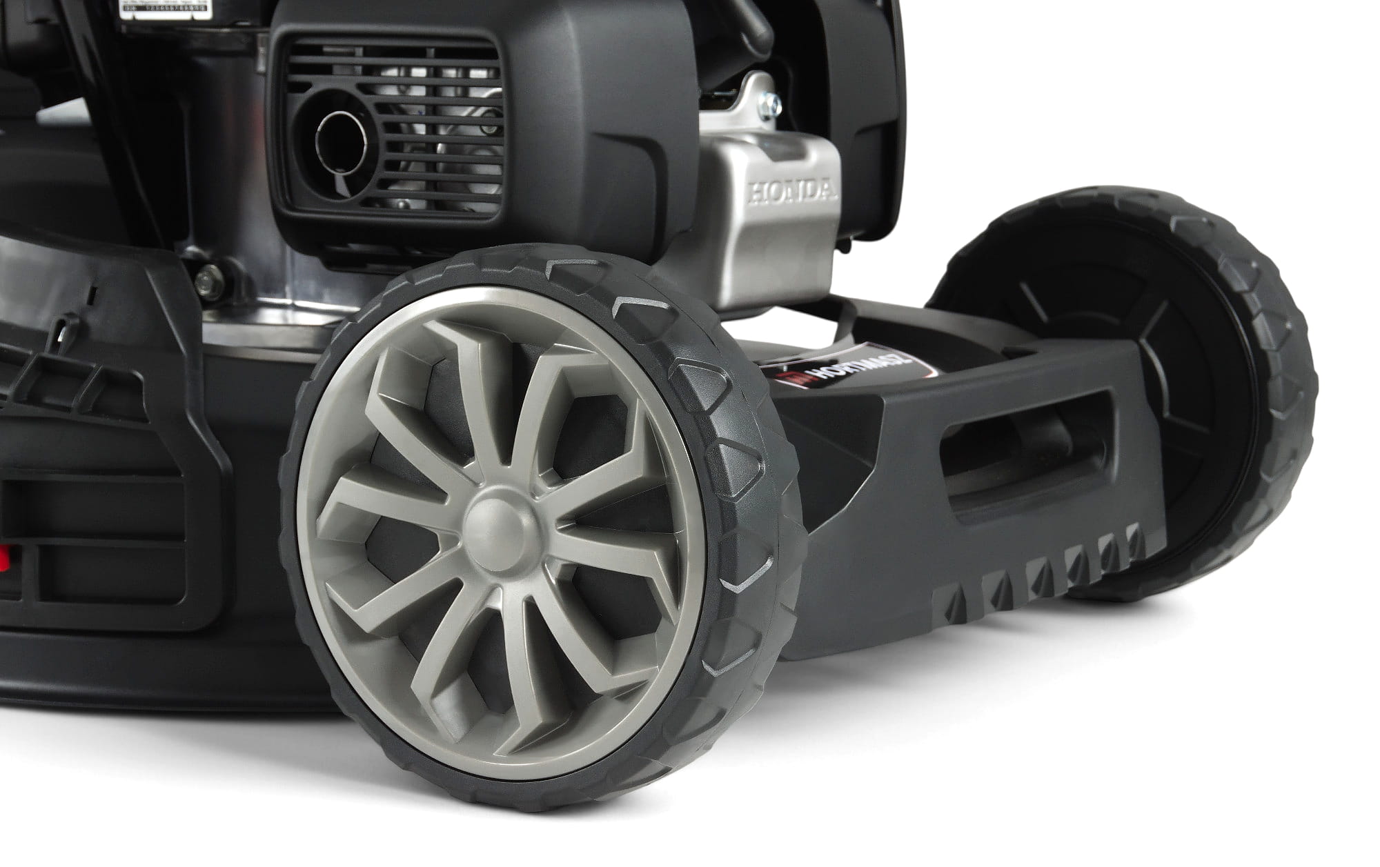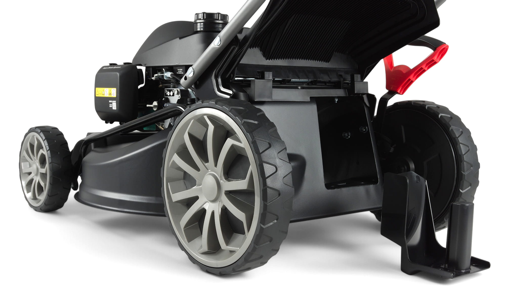 Każde koło osadzone na podwójnych łożyskach kulkowych. Kosiarka prowadzi się lekko, stabilnie i nie traci kierunku jazdy.
