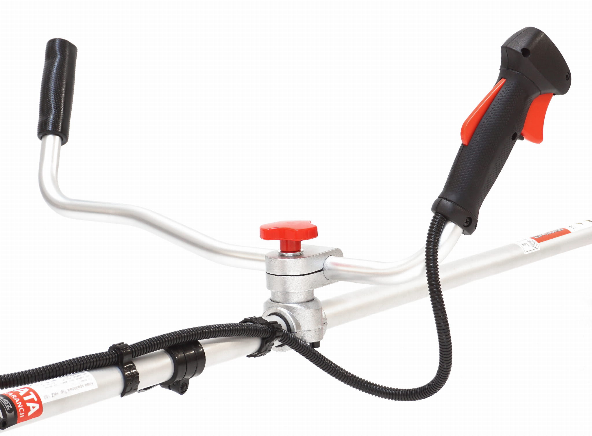 Uchwyt rowerowy daje lepszą kontrolę nad kosą i naturalne ułożenie dłoni. Wszystkie przełączniki masz pod kciukiem, więc nie musisz odrywać rąk podczas pracy.