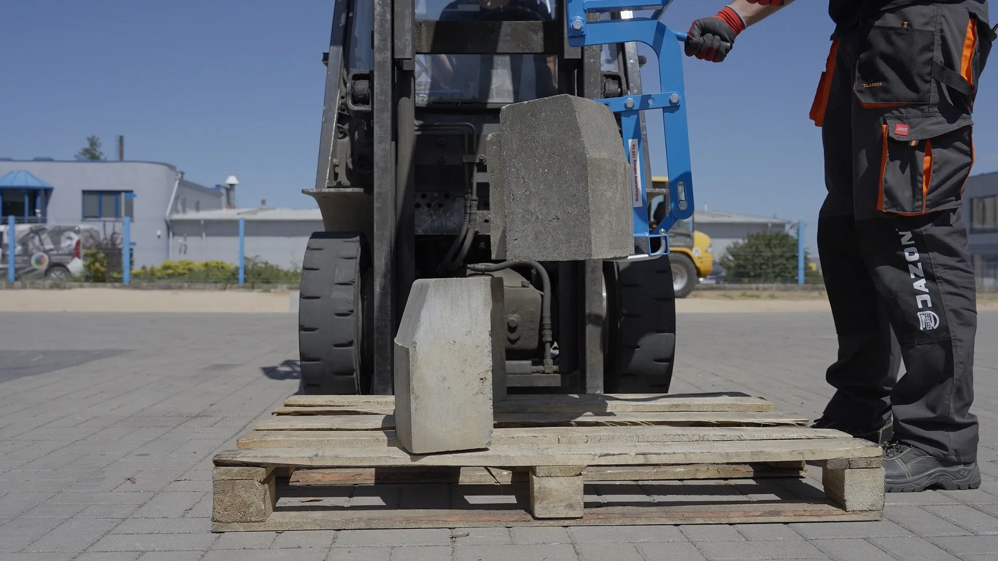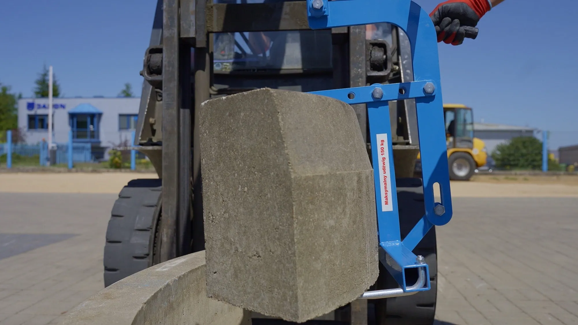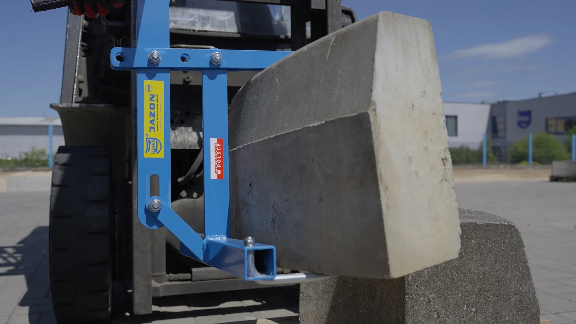 Chwytak boczny Jazon CHBZ marki Jazon to praktyczne narzędzie przeznaczone do mechanicznego przenoszenia i ustawiania krawężników podczas prac brukarskich i drogowych. Konstrukcja umożliwia podwieszenie chwytaka do maszyn budowlanych, takich jak koparki czy ładowarki, co eliminuje konieczność ręcznego podnoszenia ciężkich elementów.