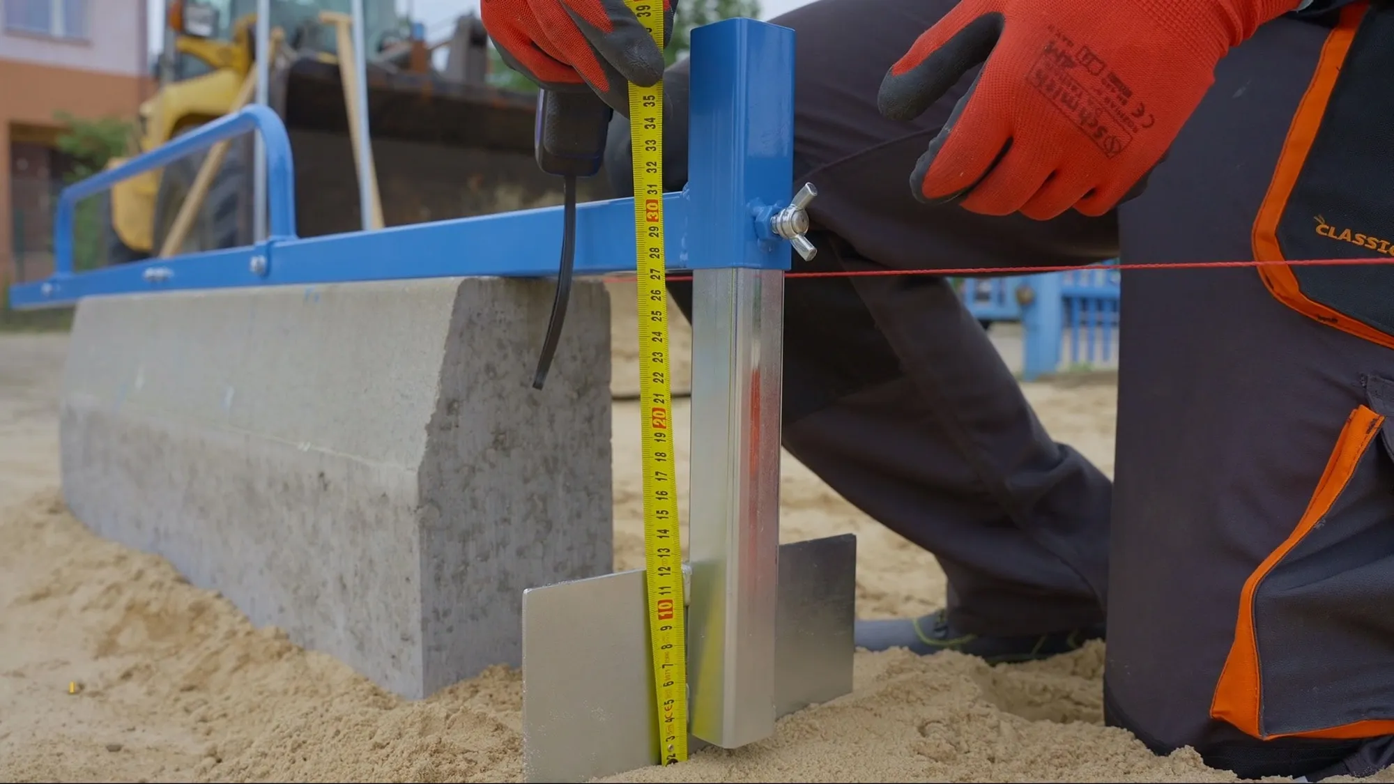 Ściągacz został zaprojektowany tak, aby umożliwić precyzyjne wyrównywanie podłoża przed ustawieniem krawężników.