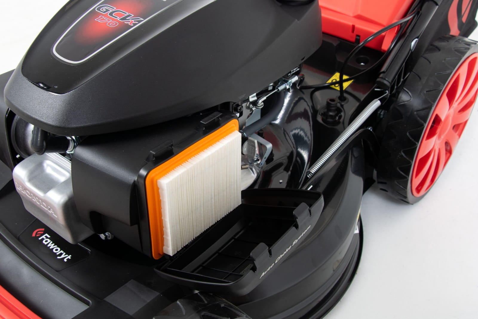 Pod maską znajdziesz sprawdzony, mocny silnik Honda GCV170 o pojemności 166 cm³ i mocy 4,35 KM. To gwarancja nie tylko dużej siły tnącej, ale przede wszystkim długowieczności i bezawaryjnej pracy przez wiele sezonów. System automatycznego ssania sprawia, że kosiarka odpala bez problemu – za każdym razem.