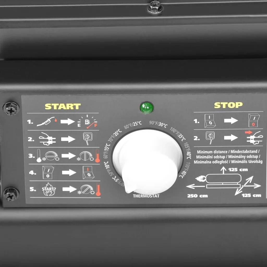 Dzięki mocy grzewczej 20 kW (70 000 BTU) i wydajności do 166 m² błyskawicznie uzyskasz komfortową temperaturę, a wentylator równomiernie rozprowadzi ciepło po całym pomieszczeniu.