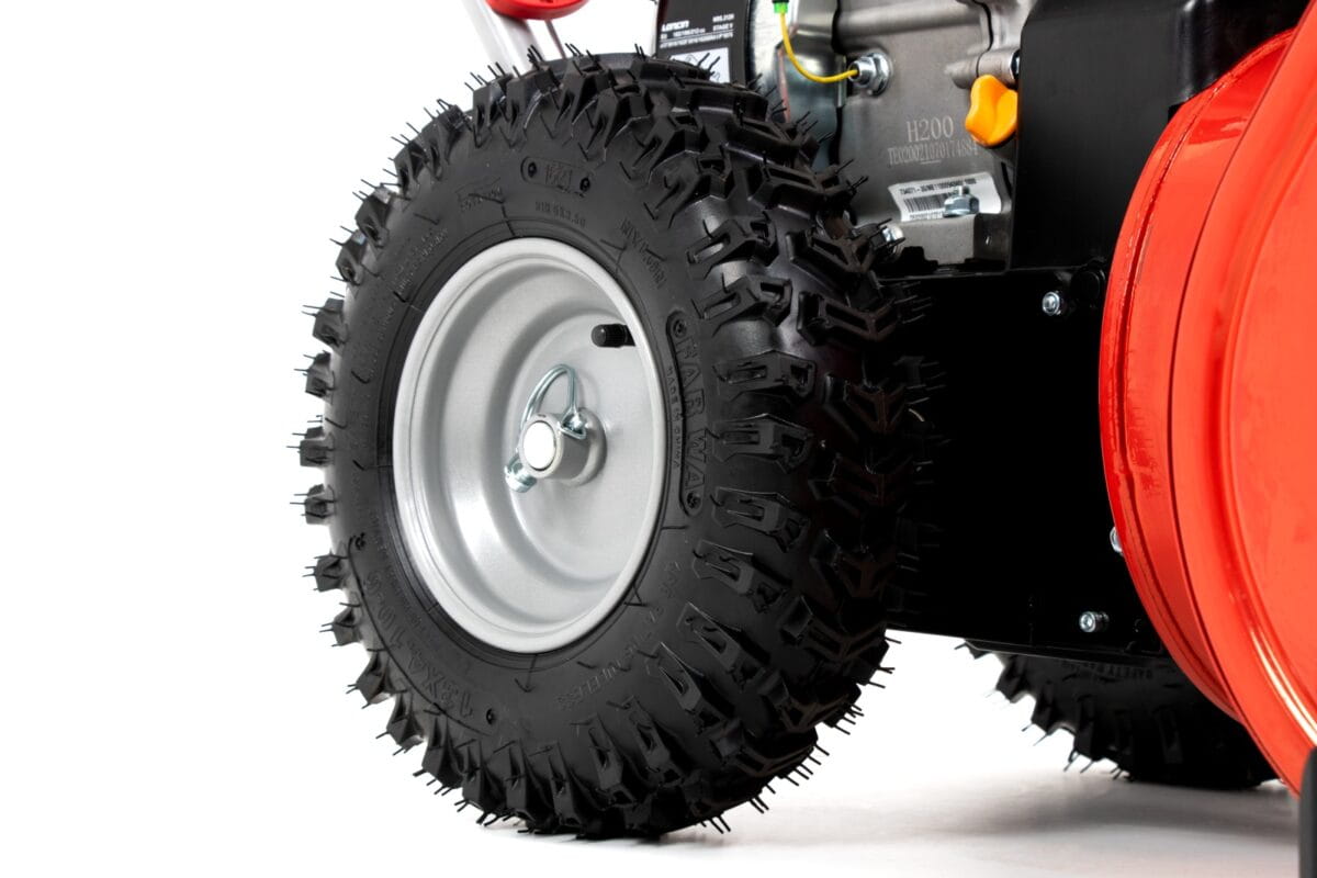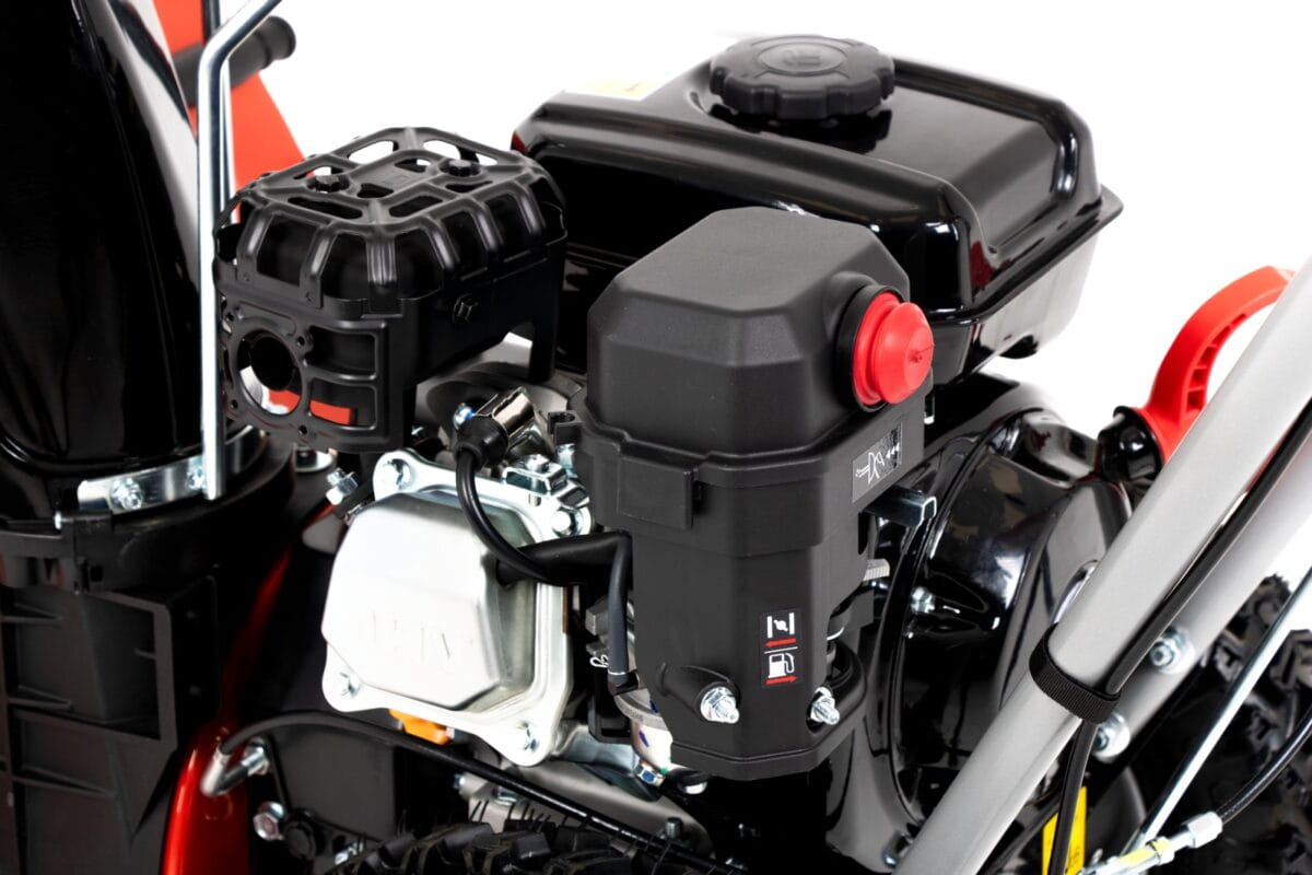 - Praca z urządzeniem jest prosta i komfortowa dzięki możliwości swobodnej regulacji odległości oraz kąta wyrzutu zgarniętego śniegu