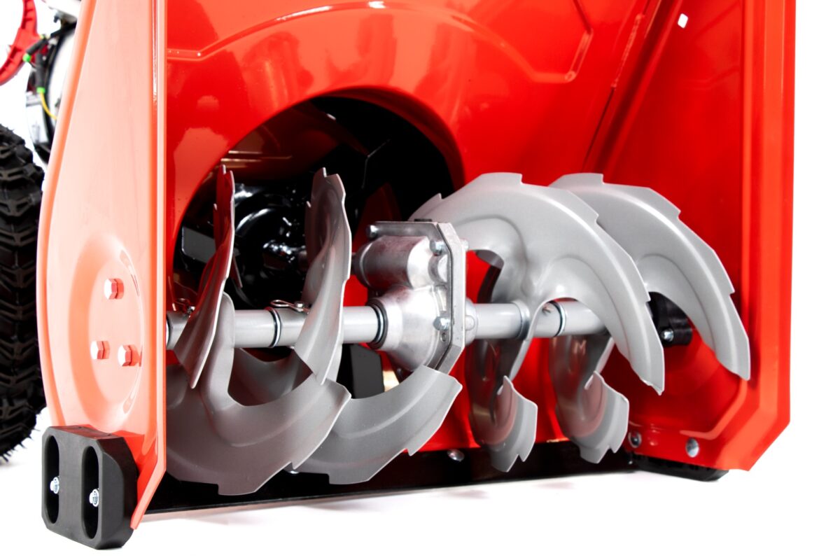 - Śnieg zbierany jest za pomocą obracającej się z dużą prędkością śruby wirnikowej. Po zgarnięciu kierowany jest on do komina, po czym wyrzucany – możesz regulować zarówno odległość, jak i kąt wyrzutu