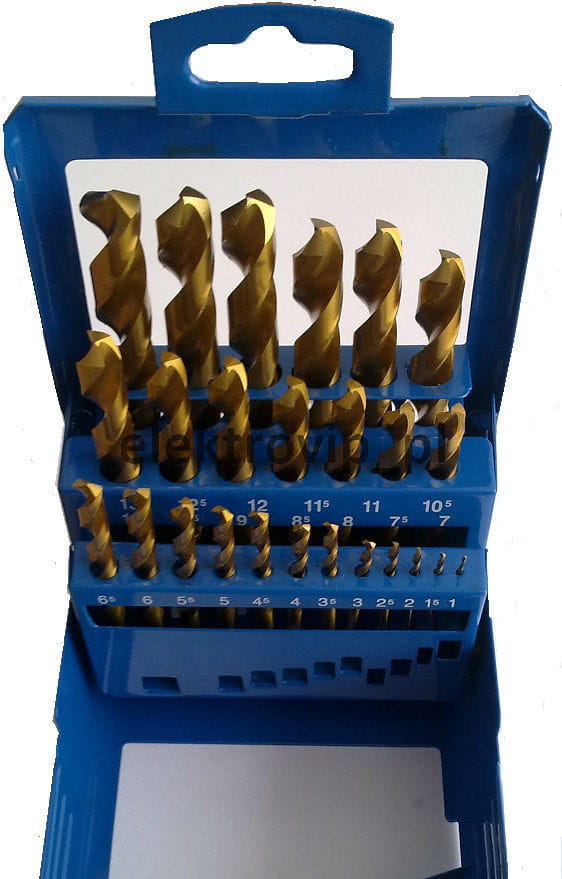 - W zestawie 25 wierteł o średnicach: 1, 1.5, 2, 2.5, 3, 3.5, 4, 4.5, 5, 5.5, 6, 6.5, 7, 7.5, 8, 8.5, 9, 9.5,