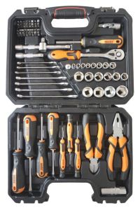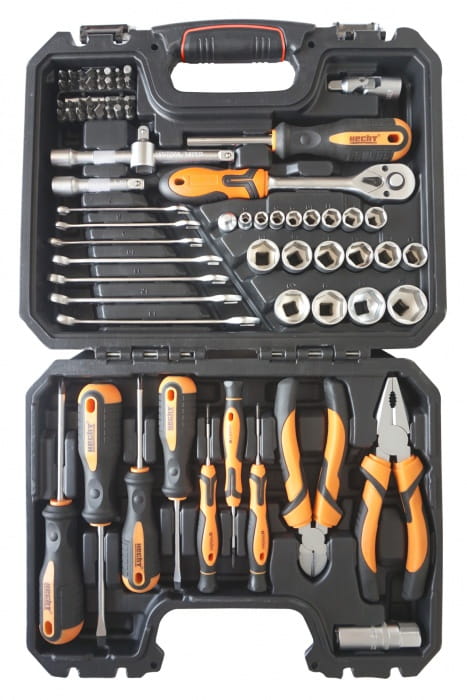 zestaw śrubokrętów, śrubokręt do bitów, kombinerki, kleszcze, zestaw bitów, magnetyczny uchwyt bitów, klucz nasadowy, zestaw kluczy płaskich, zestaw głowic nasadowych, przegub kardana, grzechotka, nasadka do świec zapłonowych, walizka.