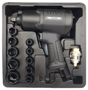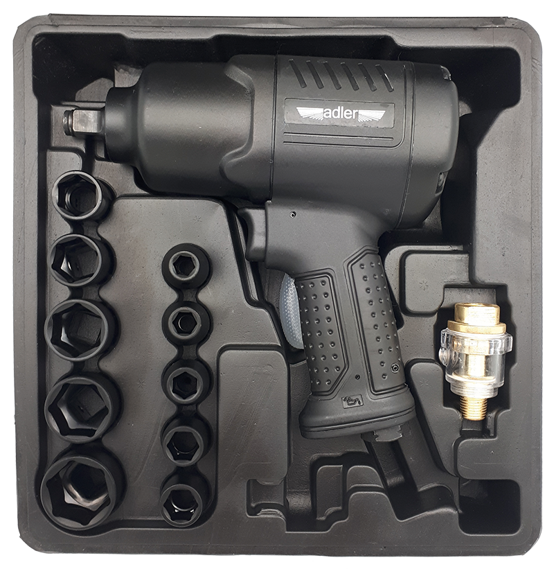 Pneumatyczny klucz udarowy 1/2" 1590Nm kompozytowy AD-1907 to narzędzie przemysłowe i warsztatowe o szerokim zastosowaniu. Wykorzystywany jest w pracach montażowych i demontażowych, przy liniach produkcyjnych, w warsztatach naprawczych i serwisach samochodowych, znajduje zastosowanie w domowych pracach garażowych. Jego zalety to trwałość, ergonomia pracy, komfort użytkowania, funkcjonalność, niska awaryjność, odporność na trudne warunki pracy (kurz, zawilgocenie, itp.). Model AD-1907 posiada lekką obudowę z tworzywa kompozytowego. Wykorzystane podzespoły, precyzja montażu oraz dbałość o każdy detal zadowoli każdego użytkownika. Mechanizm udarowy typu TWIN HAMMER szybko generuje wysoki moment obrotowy. W podzespołach klucza AD-1907 zastosowano kilka udoskonaleń technicznych które w znacznym stopniu polepszają charakterystykę pracy i moc klucza. W ZESTAWIE: 10 szt nasadki udarowe krótkie o rozmiarach (mm): 9, 10, 11, 13, 14, 17, 19, 22, 24, 27 Mini olejarka Pojemnik na olej Klucz hex Przedłużka udarowa 125mm Złączka 1/4" Walizka DANE TECHNICZNE: Model: AD-1907 Kod: MA1907 Rozmiar trzpienia (cal): 1/2 Maksymalny moment obrotowy (Nm): 1590 Obroty na minutę (r.p.m.): 7500 Średnie zużycie powietrza (l/min): 184 *przy 25% obciążeniu Ilość biegów (dokr./odkr.): 3 / 1 Max. ciśnienie pracy (bar): 6,3 Waga (kg): 4,1